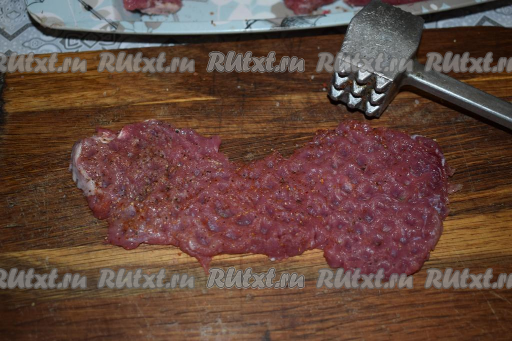 Молоточком для отбивных отбиваем каждый кусочек мяса, присыпая специями по вкусу.
