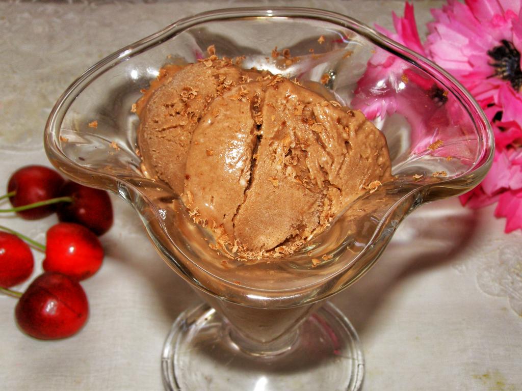 Через 4-5 часов мороженое готово (в процессе застывания не забывайте его перемешивать каждые 1,5-2 часа). При подаче к столу сливочно-шоколадное мороженое можно посыпать шоколадной или кокосовой стружкой. Это лакомство, приготовленное в домашних условиях, не только не уступает покупному мороженому, но и превосходит его по вкусу. Этот освежающий десерт прекрасно сочетается с горячим кофе.