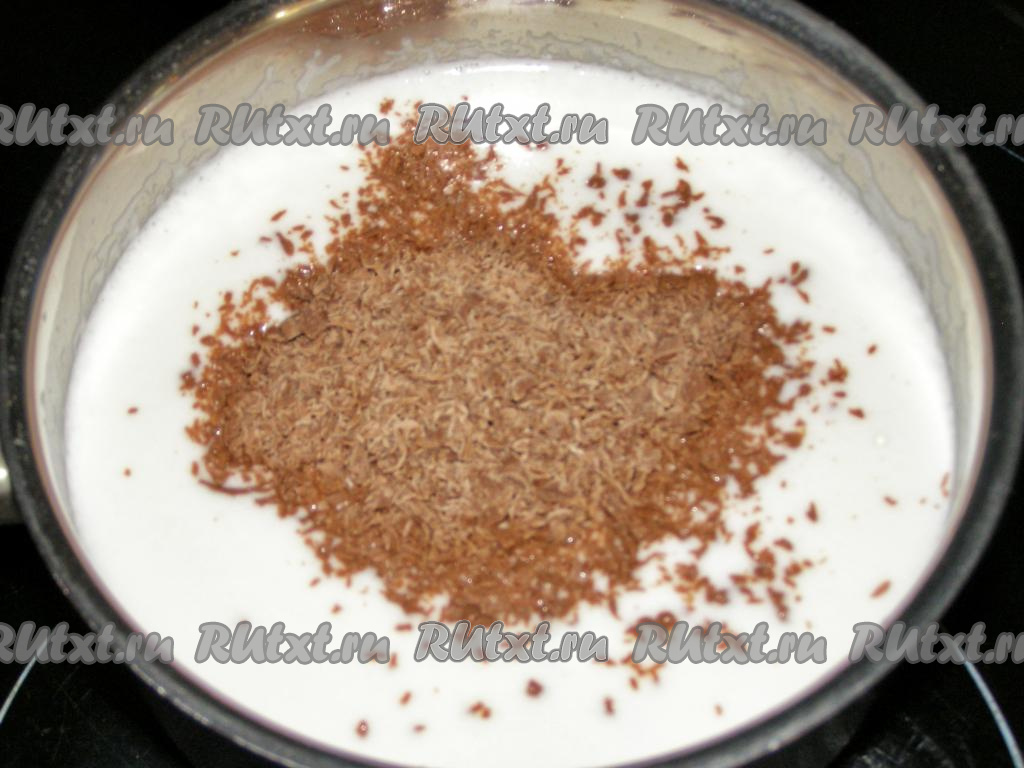 Затем всыпаем измельчённый шоколад и, не переставая перемешивать, доводим до кипения. Убираем с огня и оставляем остывать до комнатной температуры, иногда перемешивая ложкой. Чтобы масса быстрее остыла, можно поставить сотейник поверх ёмкости с холодной водой.