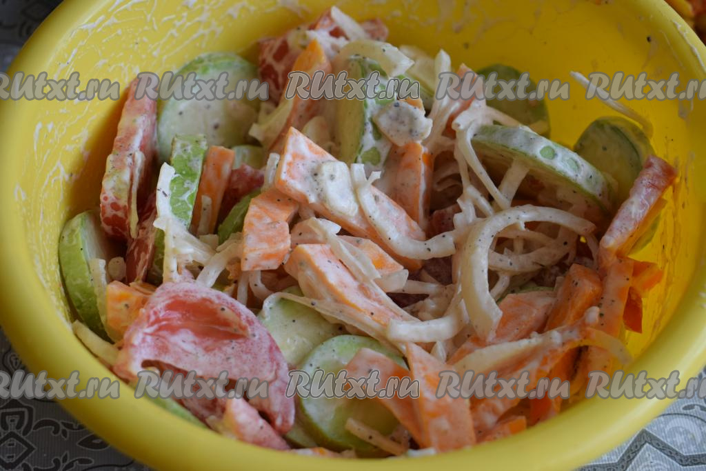 Хорошо перемешать овощи с майонезом и специями. Дать постоять, примерно, 5-8 минут (для того, чтобы овощи успели просолиться и пропитаться майонезом и специями).