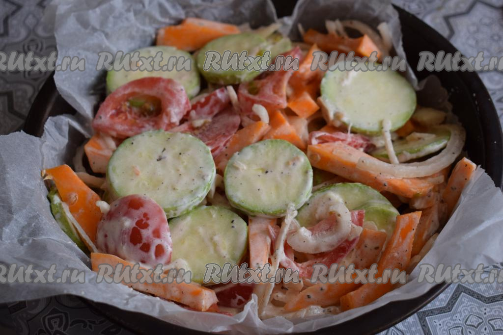 Далее форму, в которой планируете запекать овощи, застелить пергаментом (или фольгой) и выложить овощи в майонезе. Отправить форму в разогретую духовку и запекать при температуре 180 градусов, примерно, 45-50 минут.