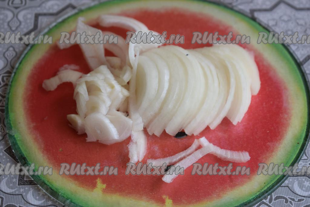Луковицу очистить от кожуры и нарезать на тонкие полукольца.