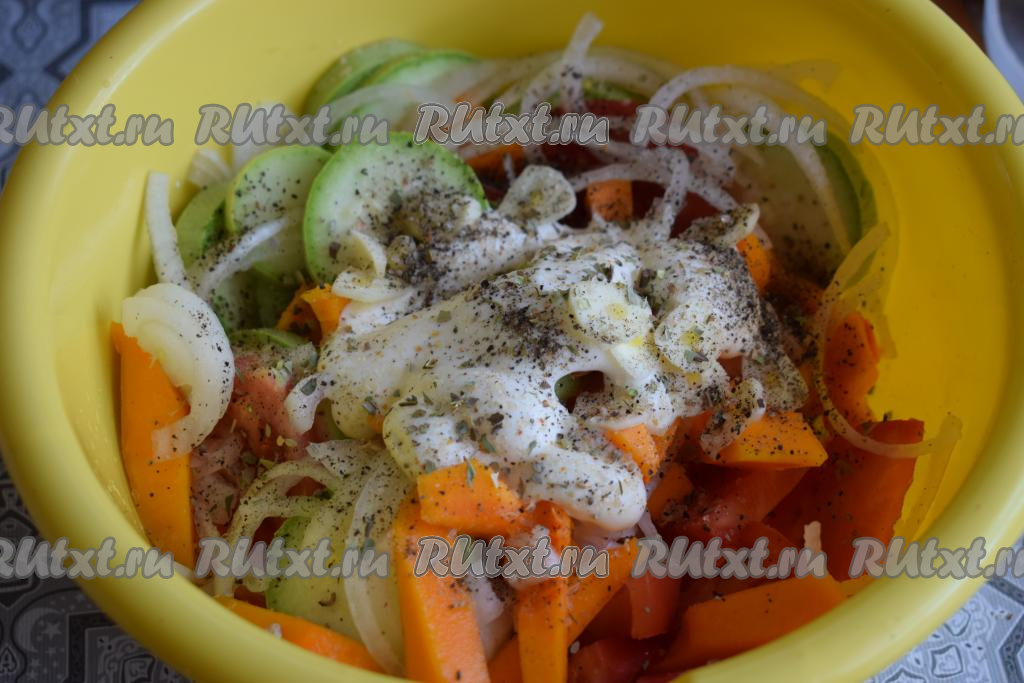 Добавить к овощам майонез, соль, любимые вами специи и чёрный молотый перец.
