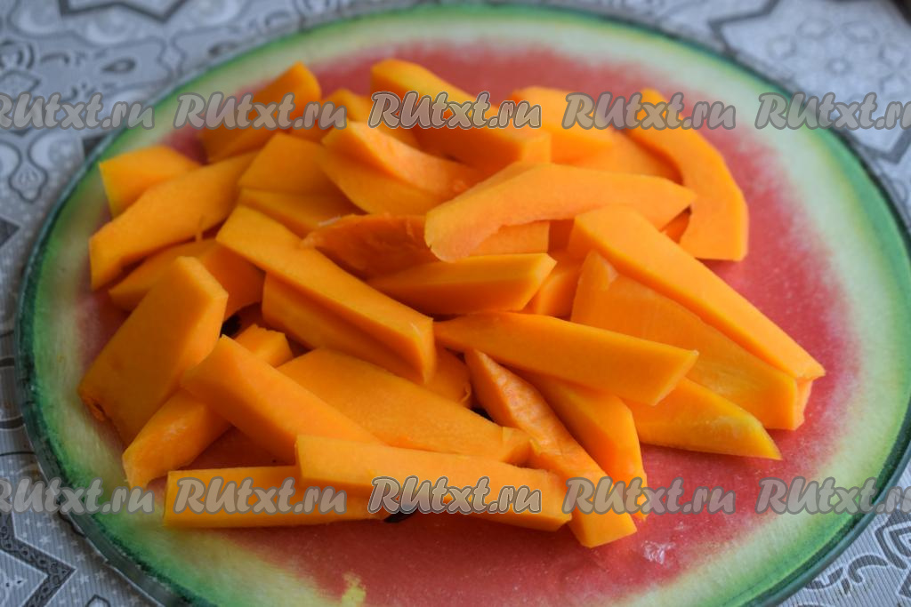 Тыкву (или морковь) очистить и нарезать на продолговатые брусочки.