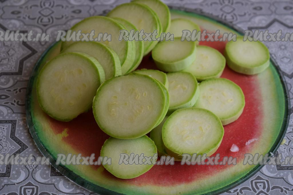 Кабачки очистить от кожицы (если используете молодые кабачки, то можно их не очищать) и нарезать на кружочки толщиной, примерно, 6-7 мм.