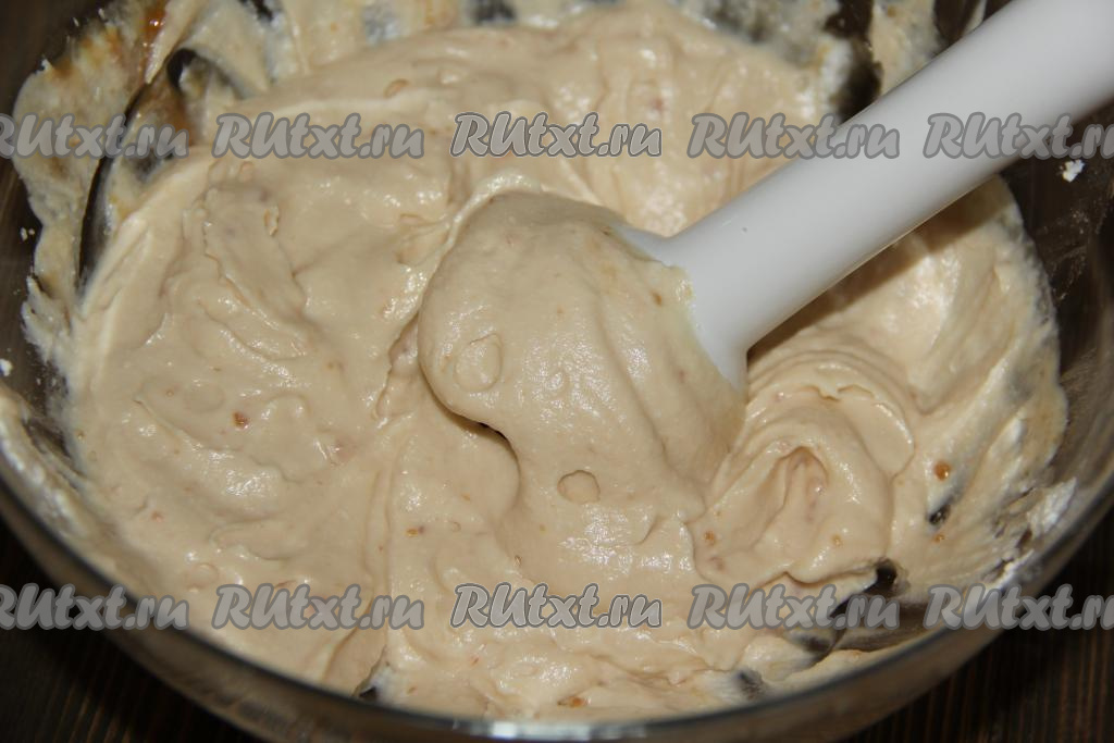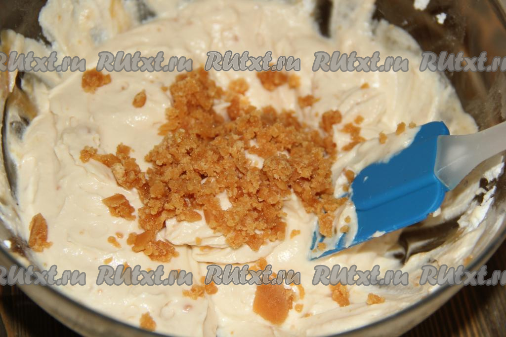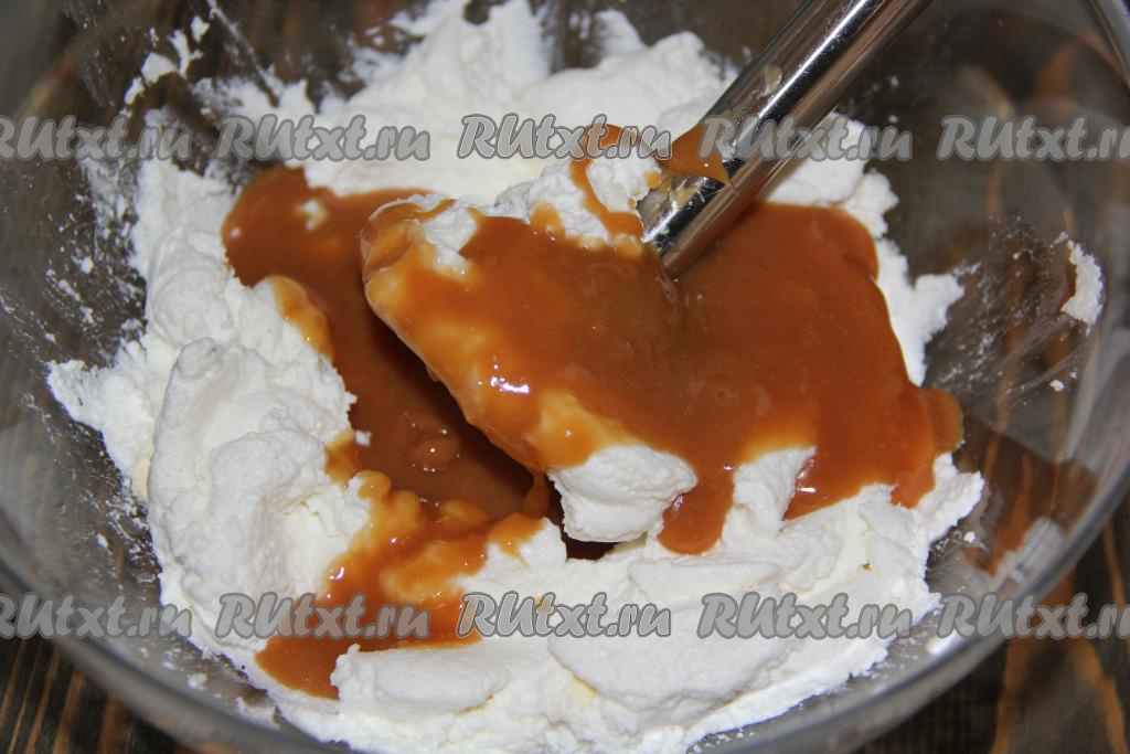 С помощью погружного блендера пробить творожную массу до однородного состояния. Затем добавить растопленную негорячую карамель из конфет.
