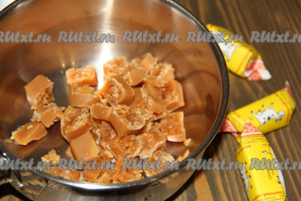 Растопить конфеты "Коровка" на медленном огне, постоянно помешивая, до однородного состояния. Затем, сняв с огня, дать карамельной массе остыть.