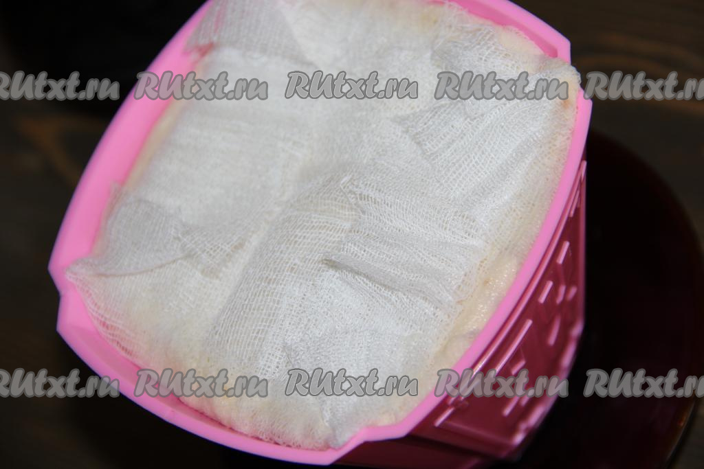 Форму для пасхи выстелить марлей так, чтобы концы марли свисали (свисающими краями марли мы в дальнейшем накроем форму с пасхой сверху).