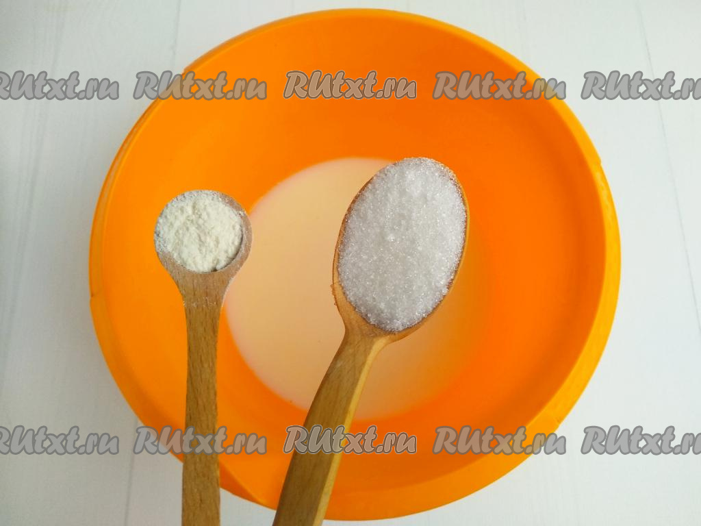 Молоко нагреть (я нагрела в СВЧ печи) до температуры 30-35 градусов, всыпать разрыхлитель и сахар, перемешать получившуюся смесь до растворения сухих компонентов.