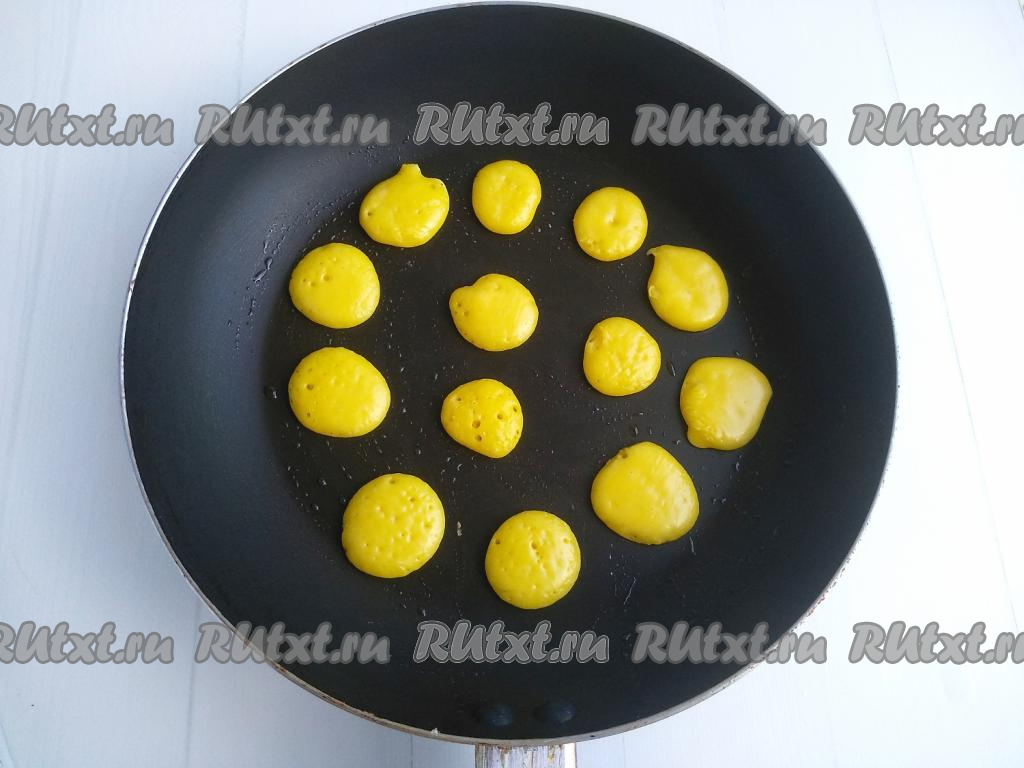 Жарить на среднем огне в течение 1 минуты (до золотистого цвета) с одной стороны, затем перевернуть и готовить до золотистости с другой стороны. Готовые мини панкейки снять со сковороды, переложить на тарелку. Таким образом пожарить все панкейки.