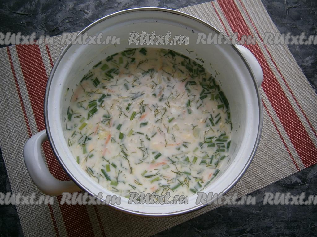 Зелень укропа и лука измельчить, добавить в кастрюлю вместе с майонезом и сметаной.