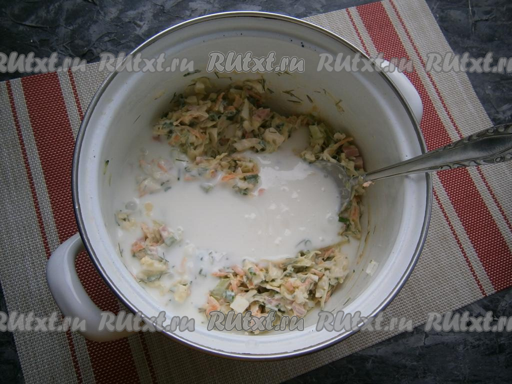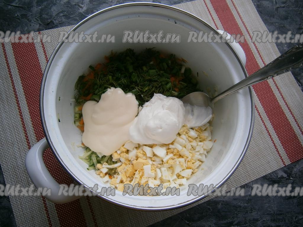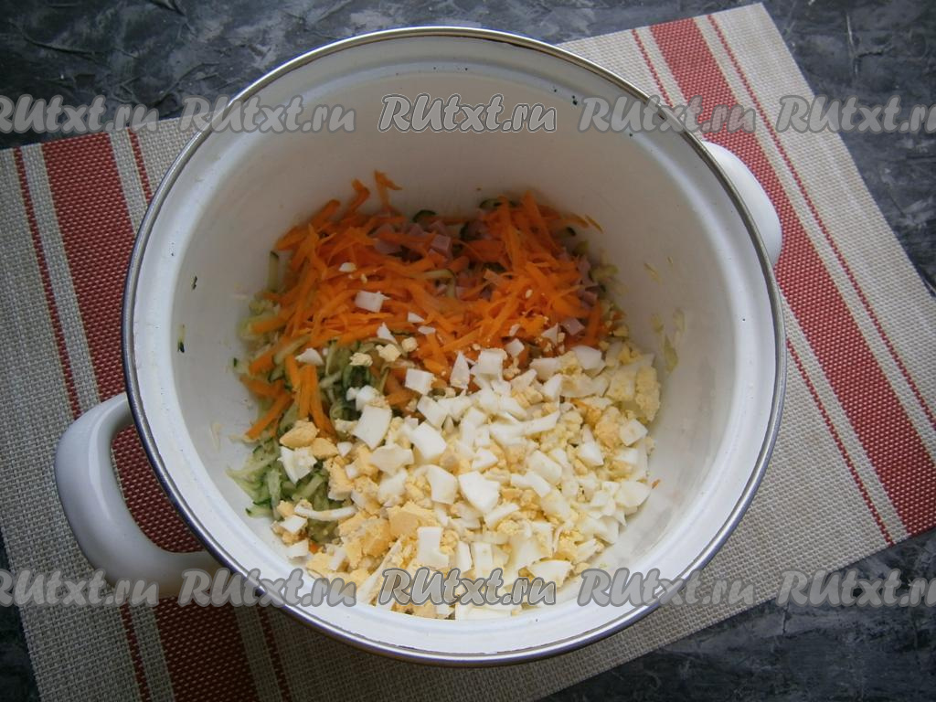 Сюда же добавить мелко порубленные варёные яйца и натёртую на крупной тёрке очищенную морковку.