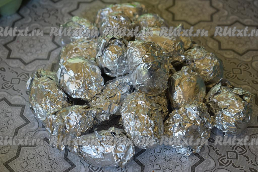 Далее берём фольгу. Каждую картошину заворачиваем в отдельный кусок фольги.