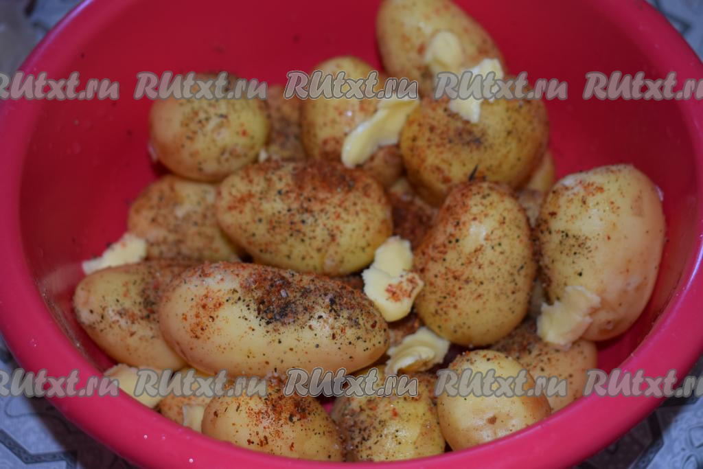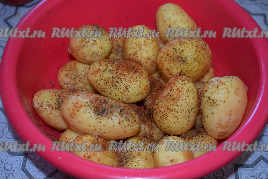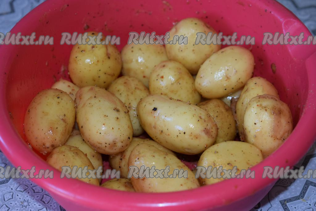 Втереть масло и специи в каждый клубень картофеля, дать постоять, примерно, 15 минут. За это время картошка просолится и может пустить сок, который необходимо слить.