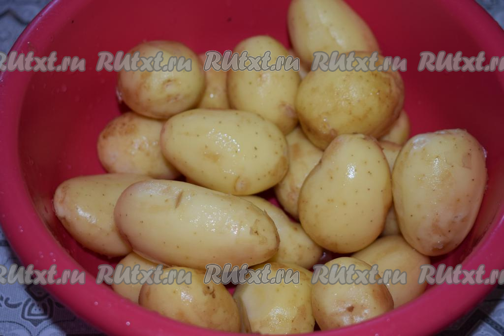 Молодой картофель промыть под холодной водой, затем обсушить и очистить от кожицы.