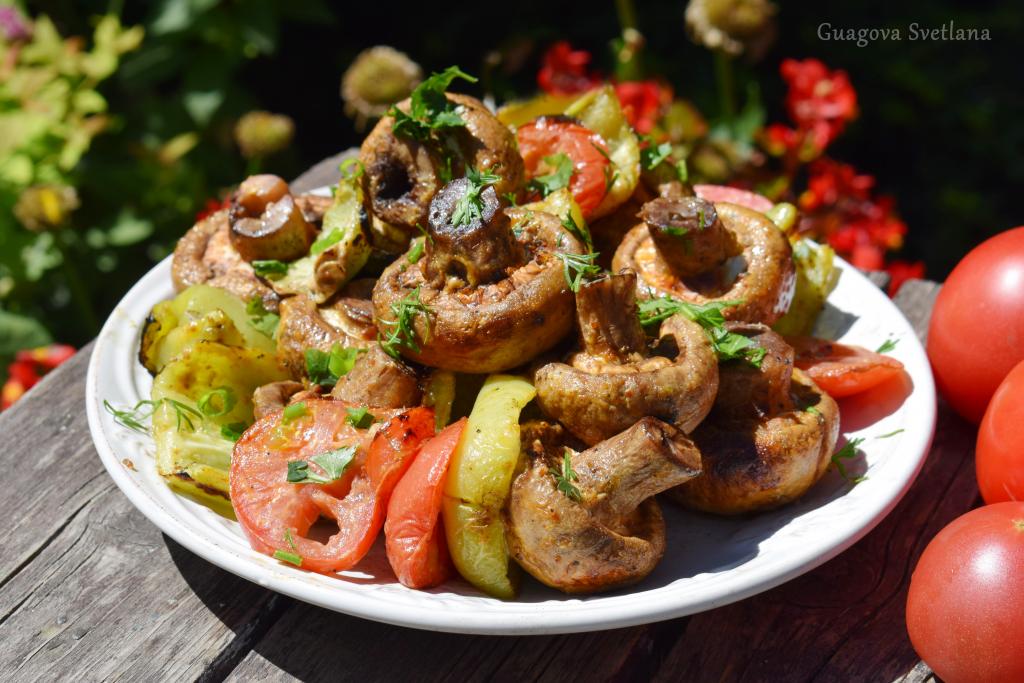 Вкуснейший шашлык из грибов и овощей готов! Овощи и шампиньоны получаются бесподобными, сочными, не пресными, ароматными. Когда в следующий раз соберётесь на пикник, непременно приготовьте шашлык из шампиньонов на шампурах по этому рецепту, вы не пожалеете!