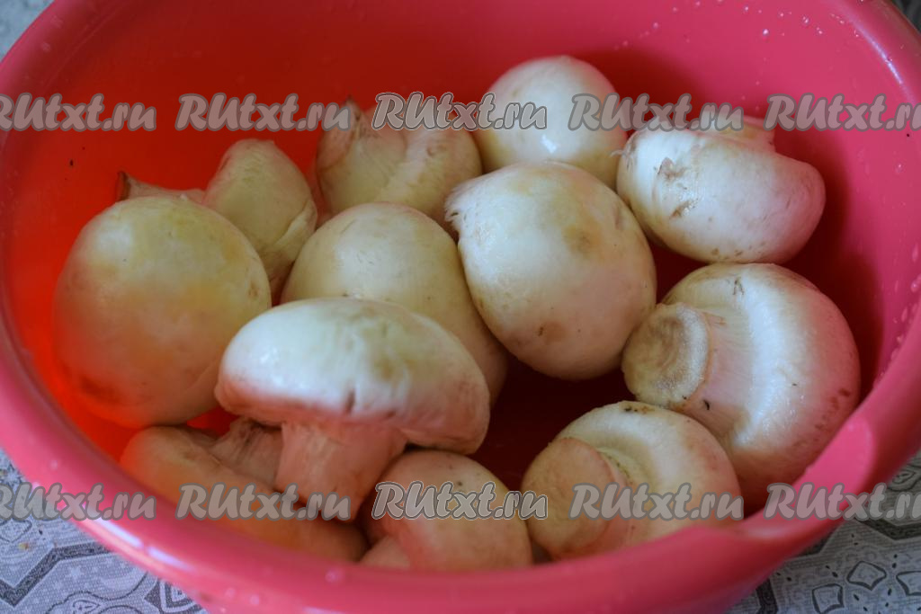 Шампиньоны промоем под холодной водой и обсушим бумажными полотенцами. Выкладываем грибы в глубокую миску.
