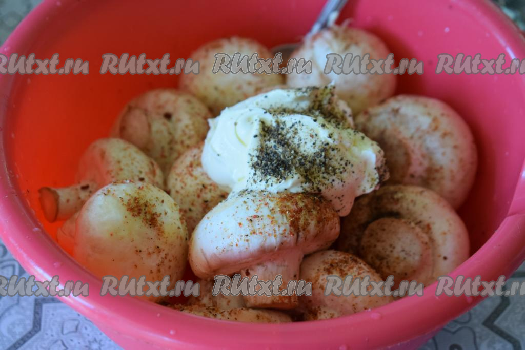 К шампиньонам добавляем сметану, соль, чёрный молотый перец, специи и тщательно перемешиваем.