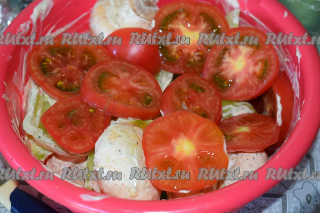 Помидоры нарезаем на кружочки и также отправляем в миску.
