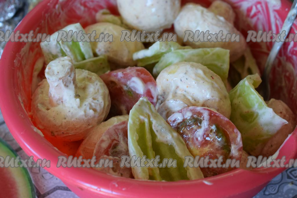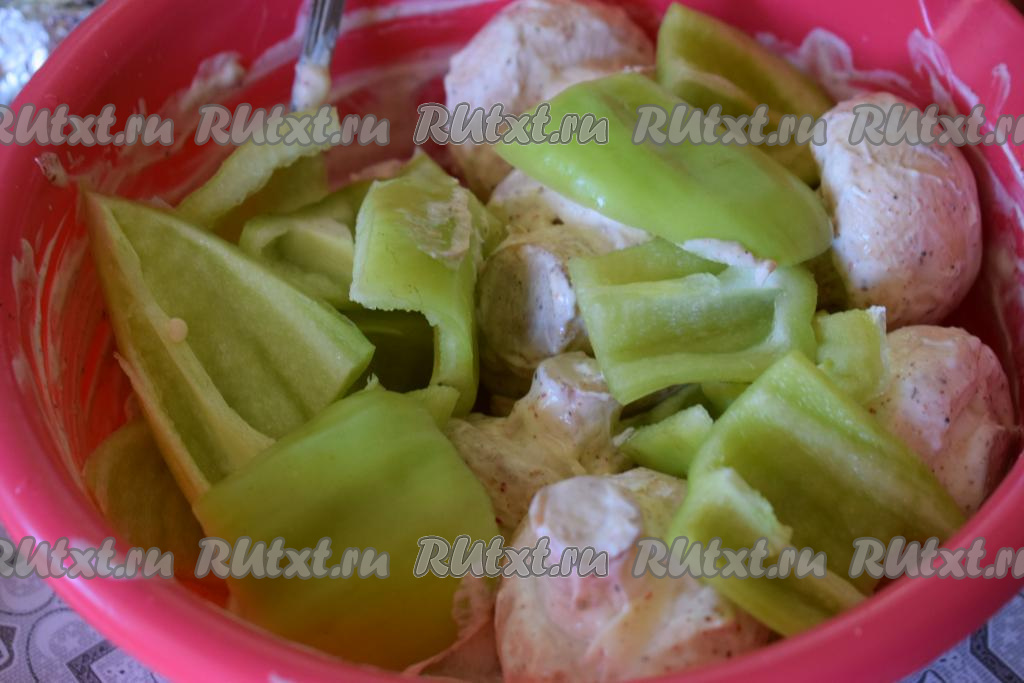 Перемешиваем все овощи между собой и оставляем на 2 часа промариноваться при комнатной температуре. Вместо перца и помидоров можно взять другие овощи, отлично подойдут молодые кабачки, баклажаны и репчатый лук.