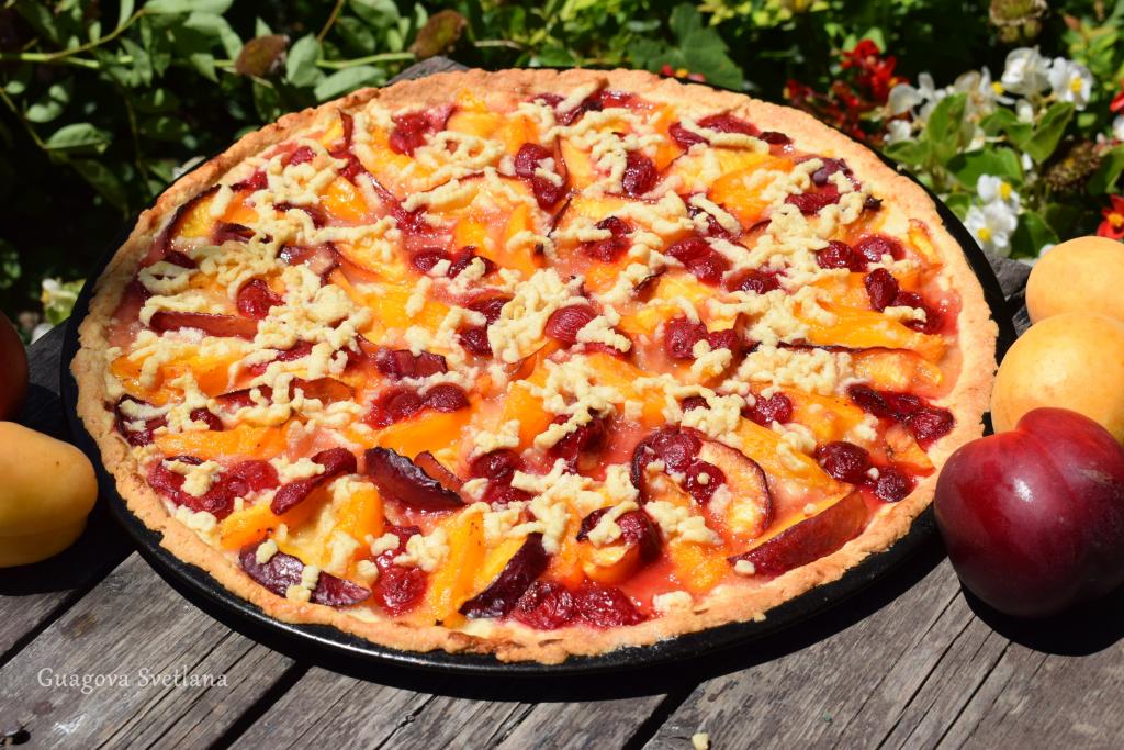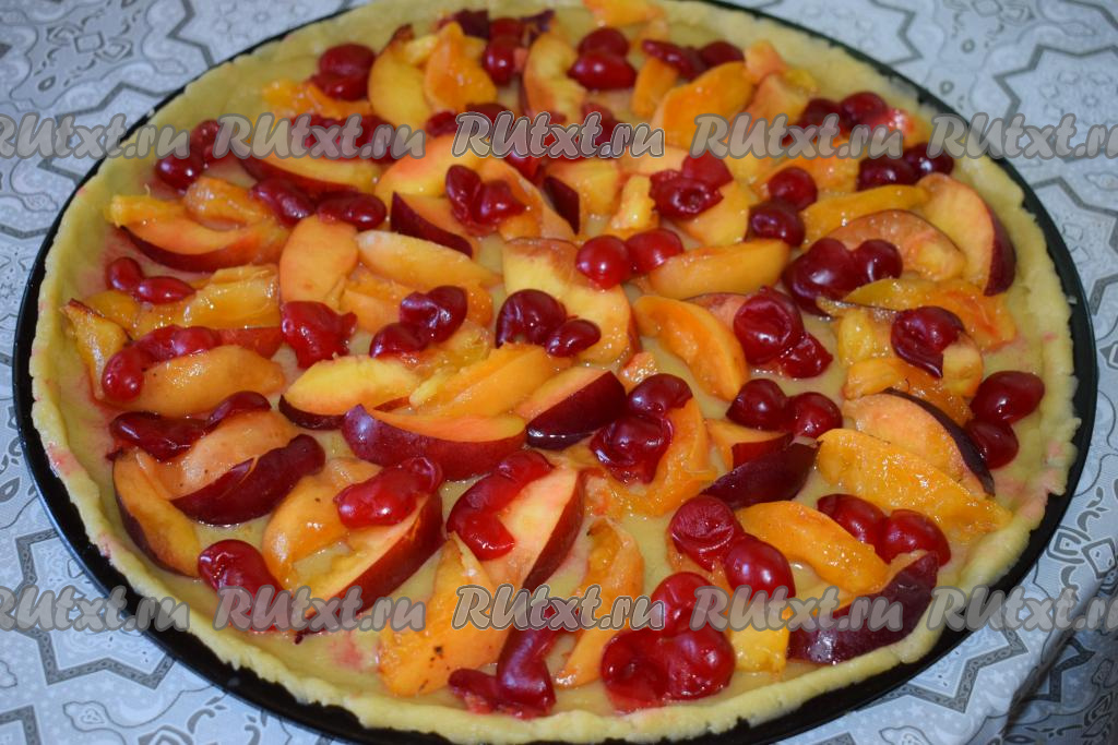 Готовая выпечка будет пахнуть фруктами, ягодами и вызывать аппетит у ваших домочадцев. Нежное песочное тесто, сочные фрукты и кислинка вишни делают этот открытый пирог очень вкусным! С такой выпечкой любое семейное чаепитие станет незабываемым!