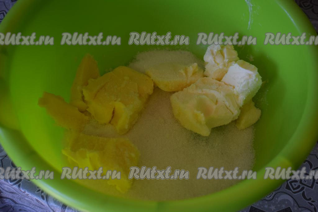 Сливочное масло заранее достаньте из холодильника, чтобы оно, немного полежав при комнатной температуре, стало достаточно мягким. Для замешивания теста насыпаем в миску сахар и ванилин, добавляем размягчённое сливочное масло.