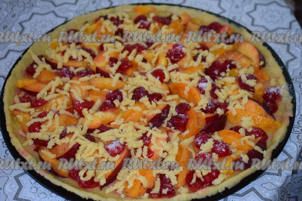 Натираем на крупной тёрке оставшийся маленький кусочек теста и распределяем натёртое тесто по всей поверхности песочного пирога поверх фруктов и ягод.