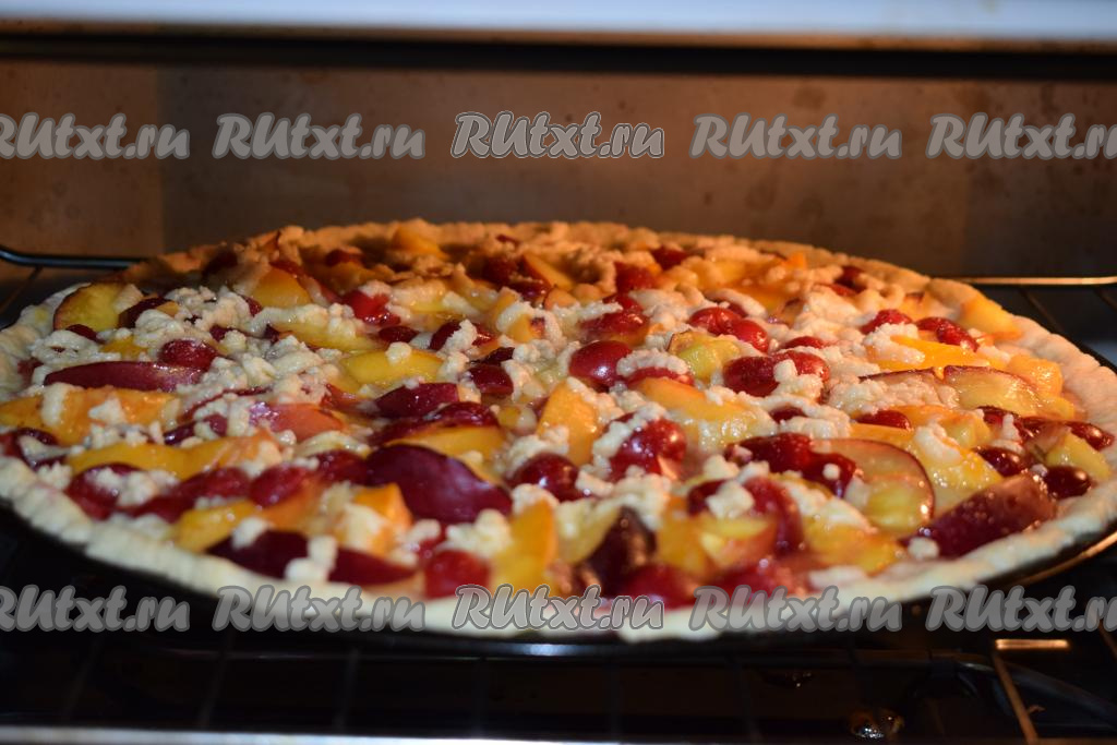 Отправляем пирог с фруктово-ягодной начинкой в разогретую духовку и выпекаем при температуре 180 градусов, примерно, 35-40 минут.