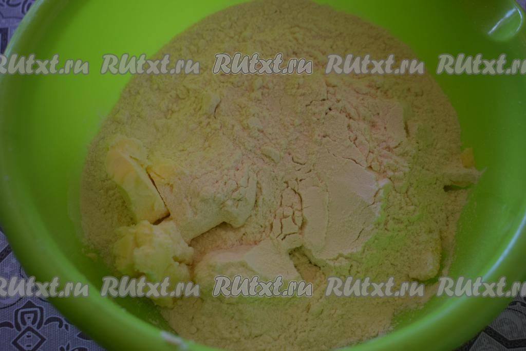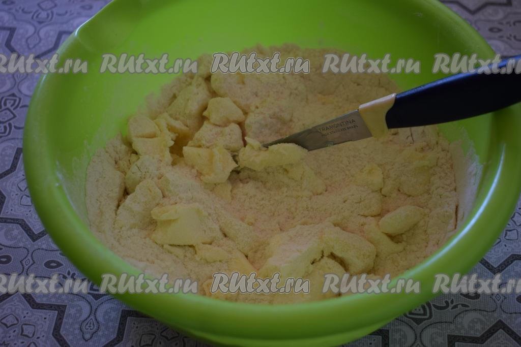 Ножом рубим масло с сахаром и мукой в крошку.