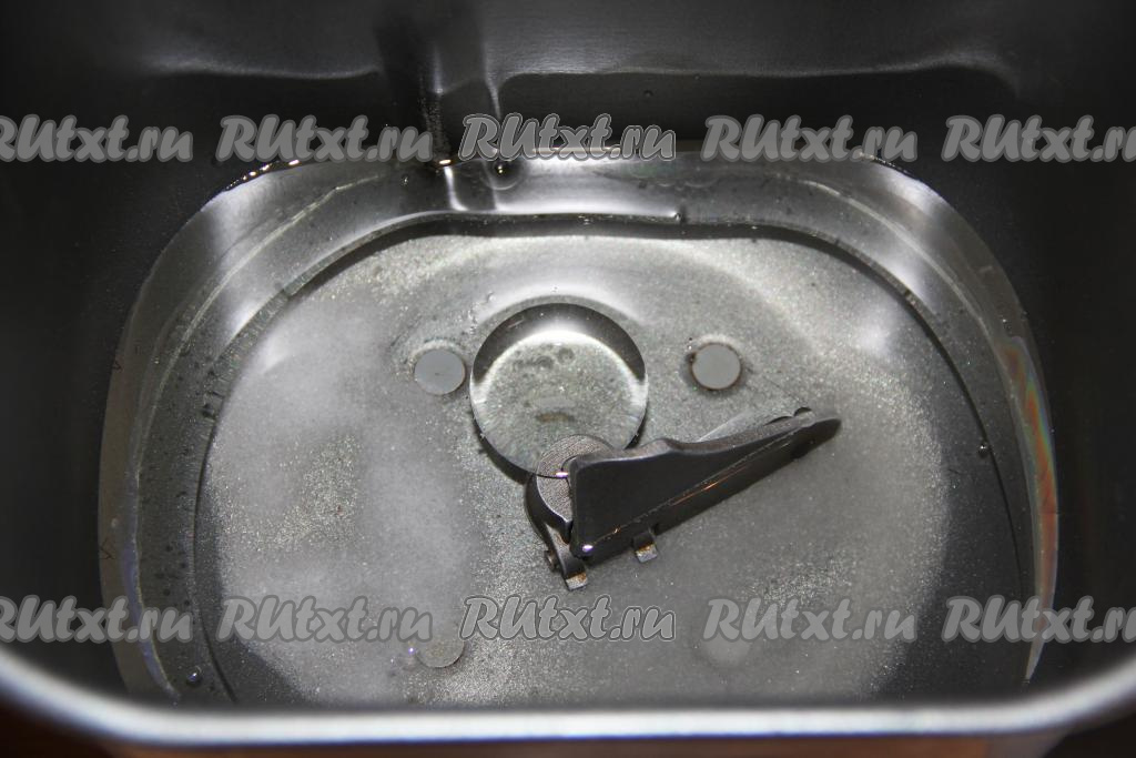 Влить воду комнатной температуры в ведёрко хлебопечки, всыпать соль и сахар.