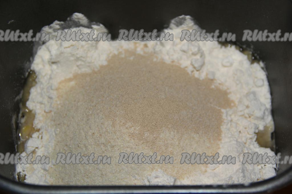 Затем всыпать дрожжи и выставить режим "Белый хлеб" или "Основной" (в моей хлебопечке такой режим занимает 3 часа 10 минут). В процессе замеса заглянуть в хлебопечку, если тесто сильно подлипает к стенкам и не собирается в ком, добавить дополнительный объём муки (я добавила 3 столовые ложки муки).
