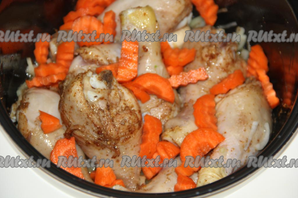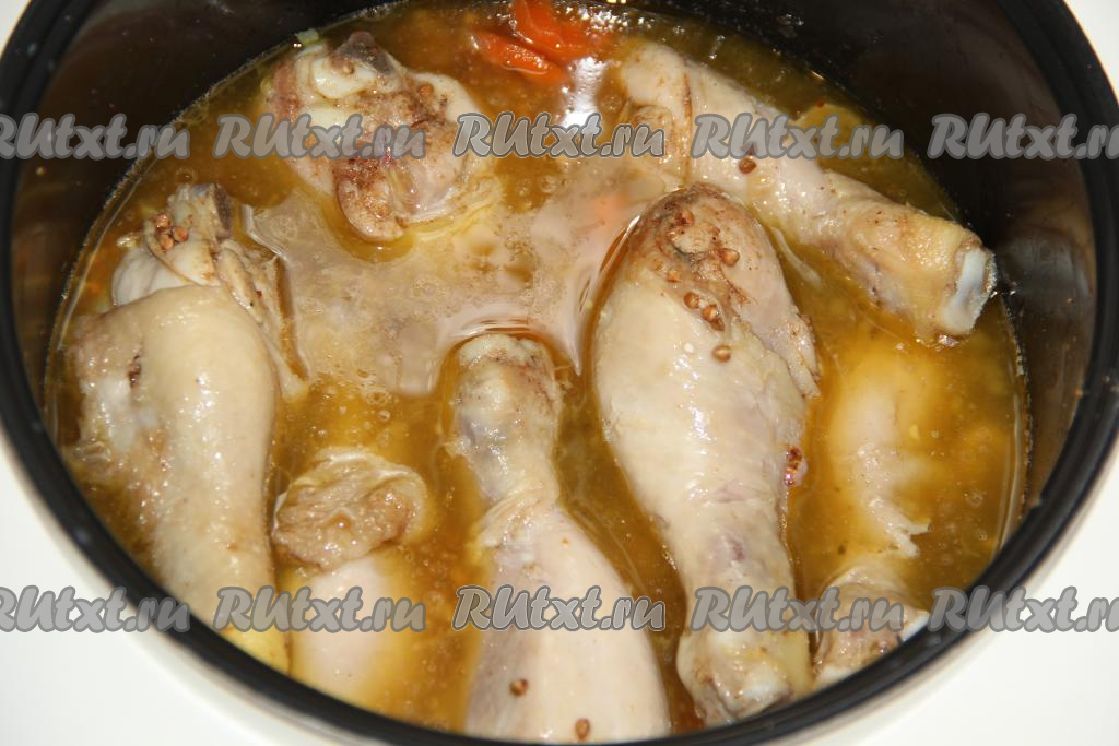 Влить в чашу мультиварки, примерно, 3 столовые ложки растительного масла. Выставить режим "Жарка". Выложить плотно куриные ножки.