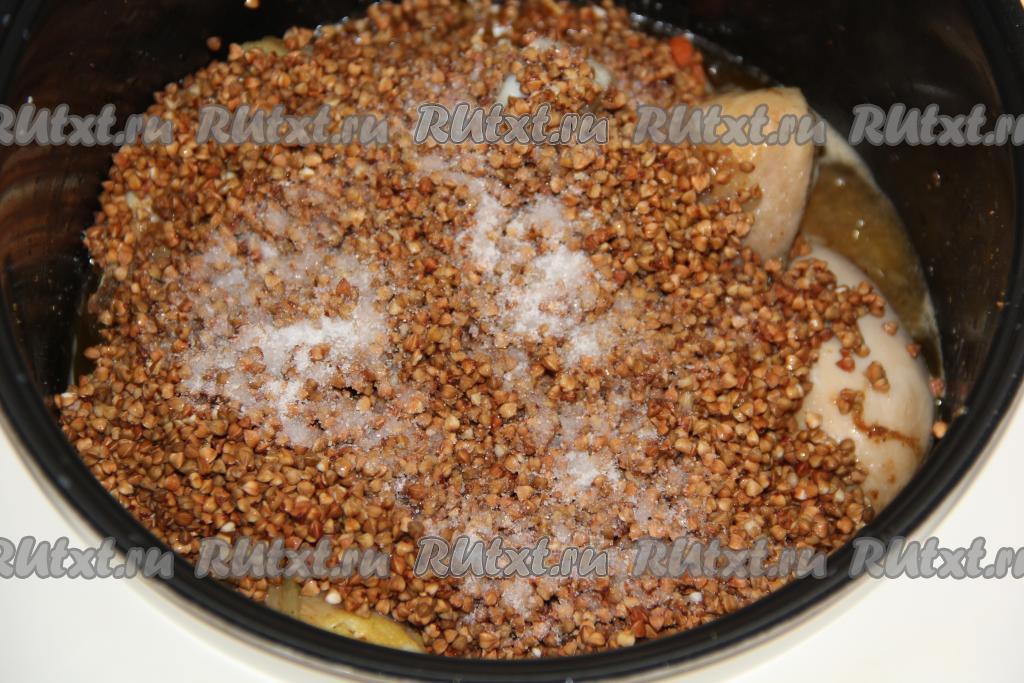 Гречневую крупу хорошо промыть и переложить в чашу мультиварки, добавить соль по вкусу.