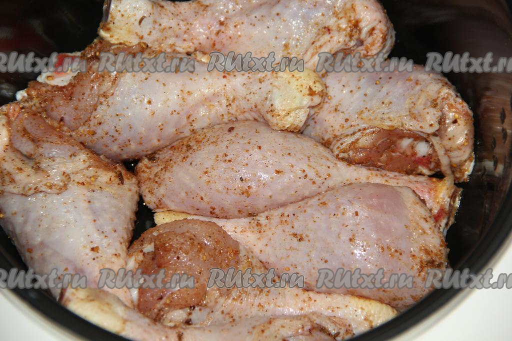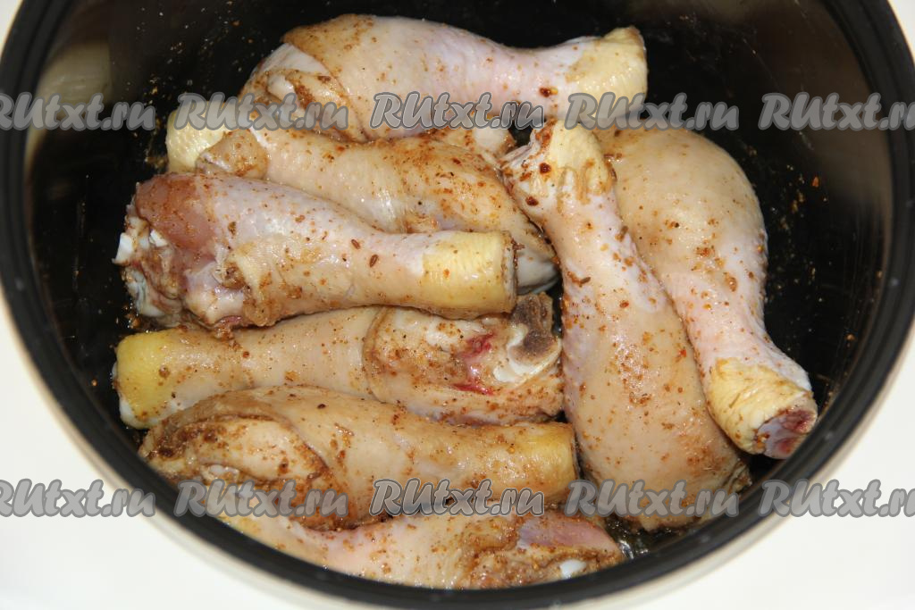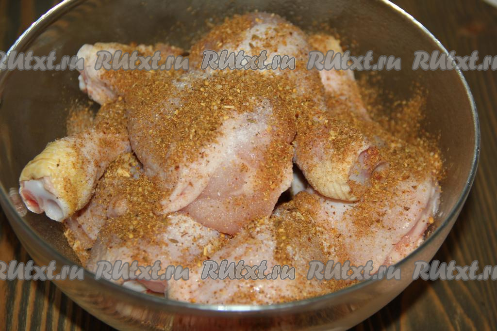 Куриные ножки промыть и обсушить, добавить соль и специи. Хорошо втереть специи в куриные ножки и оставить мариноваться на 1-2 часа.