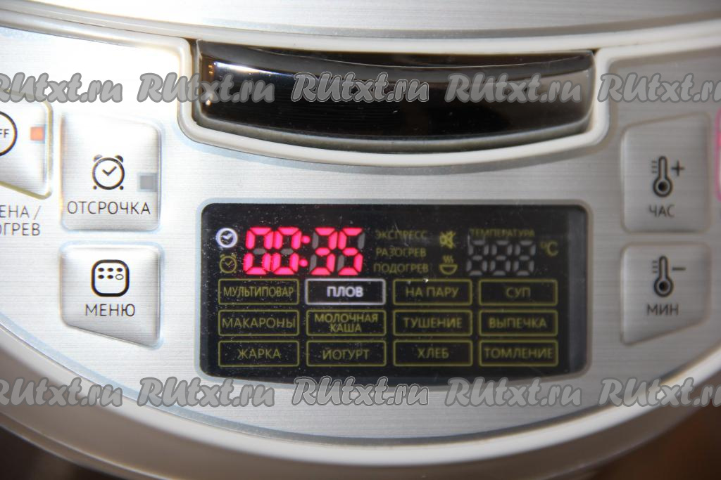 Крышку мультиварки закрыть и включить режим "Плов" на 35 минут.