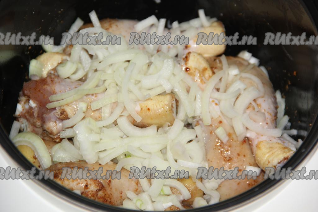 Лук почистить, нарезать тонко (полукольцами) и выложить к обжаренным куриным ножкам. Готовить лук с куриным мясом минут 5, периодически аккуратно перемешивая.