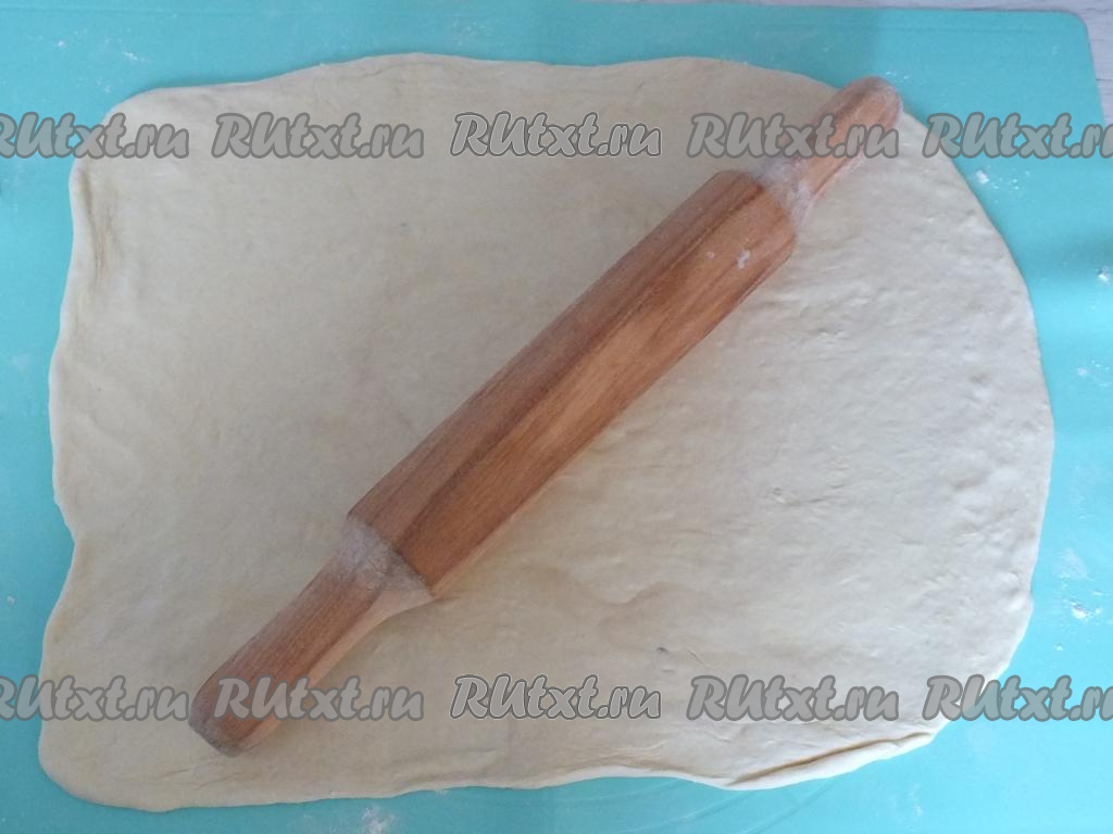 Рабочую поверхность подпылите мукой. Разложите на неё размороженное слоёное бездрожжевое тесто и раскатайте в тонкий пласт толщиной около 0,5 см. Я раскатываю по размеру своего противня (30 см на 36 см).