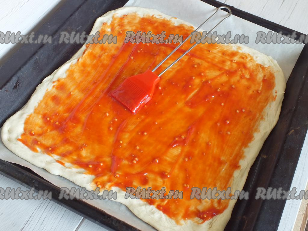 Противень застелите бумагой для выпечки. Выложите раскатанное слоёное тесто. Сделайте частые проколы вилкой. Смажьте тесто томатным соусом, не доходя до краёв по 1 см.