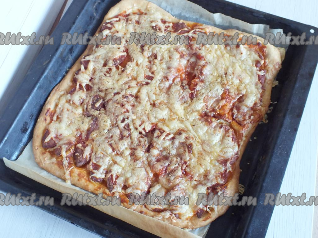 Поверх колбасы натрите сыр, равномерно распределяя его. Сверху присыпьте, по вкусу, специями. Поставьте пиццу выпекаться в разогретую до 180 градусов духовку на 20 минут (ориентируйтесь на свою духовку!).
