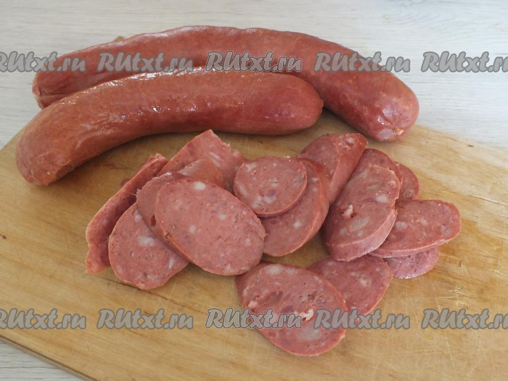Разложите на томатный соус нарезанную колбасу.