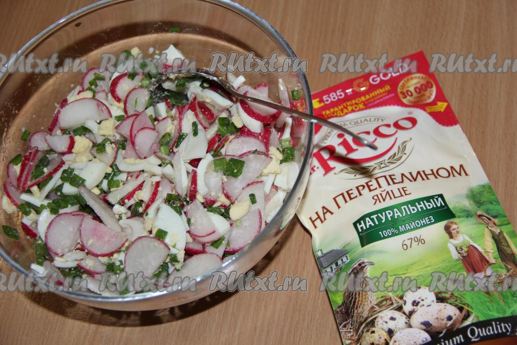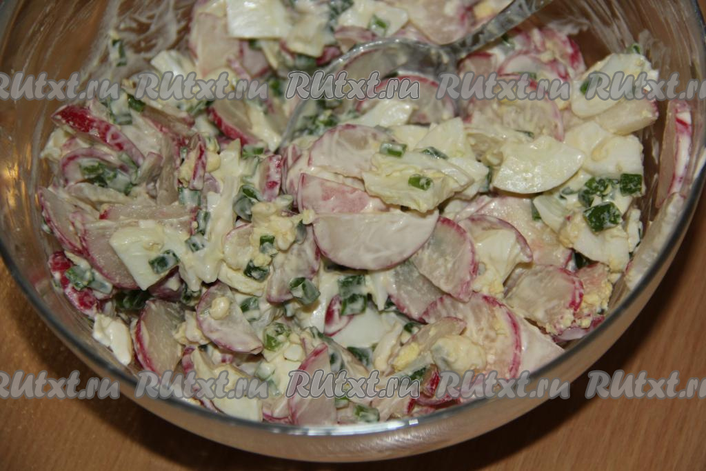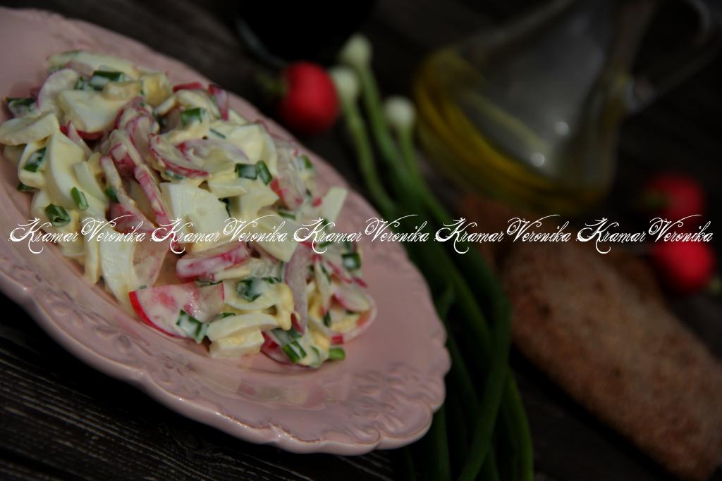 Вкусный, нежный, аппетитный салат из редиски с варёными яйцами и зелёным луком подать к столу. Это простое блюдо прекрасно впишется в повседневное меню, попробуйте!