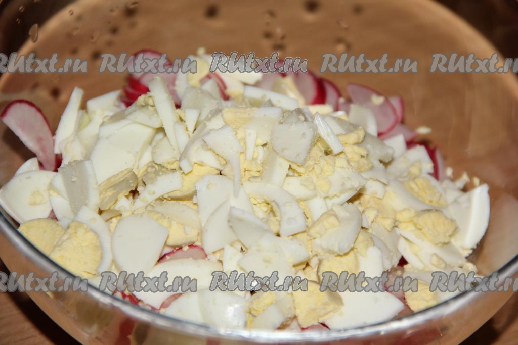 Очистить яйца, нарезать на средние кусочки и добавить к редиске.