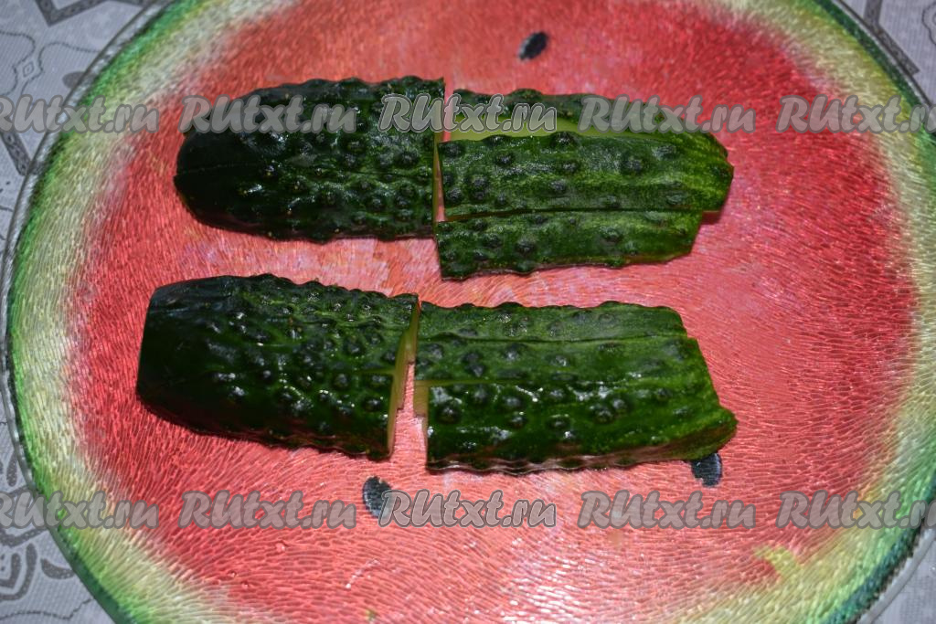 Каждый огурец разрежем пополам вдоль, далее каждую из половинок нарезаем вдоль на 2-3 полосы, затем делаем один разрез поперёк (как на фото).