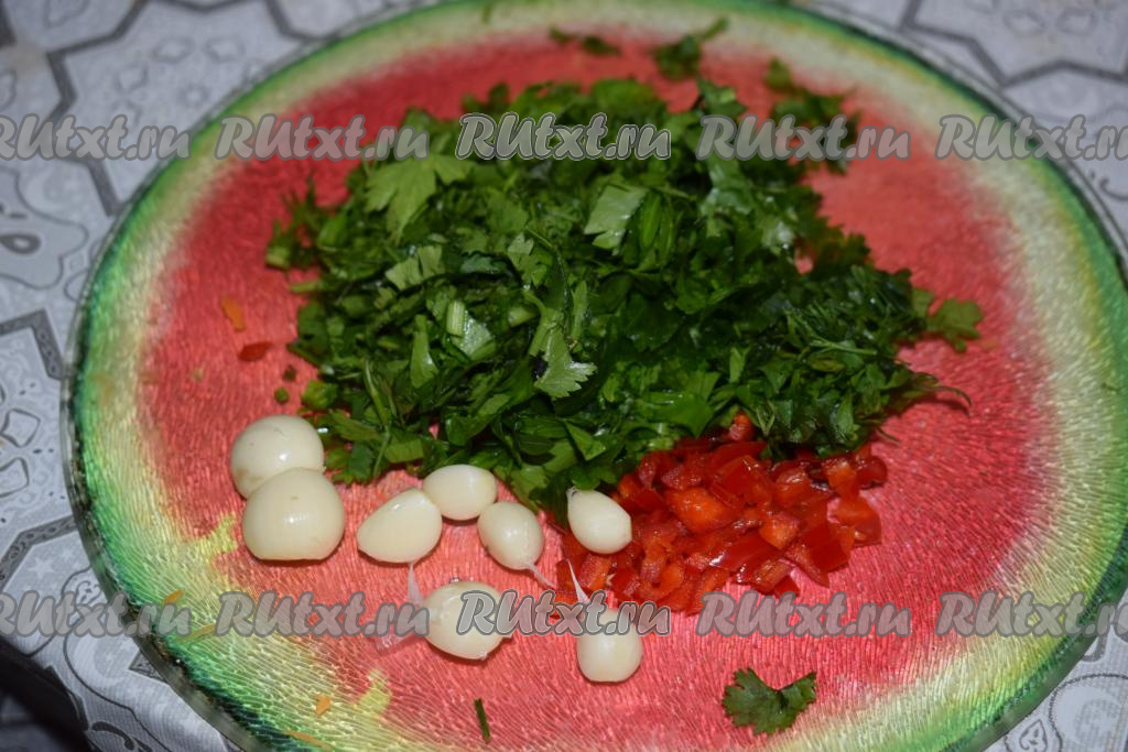 Зелень и зелёный лук нарезаем мелко. Чеснок очищаем от шелухи и пропускаем через пресс, острый перец нарезаем на мелкие кусочки.