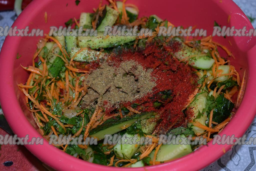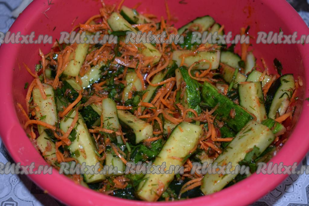 Хочу поделиться рецептом острого салата из огурцов. Этот вкусный овощной салатик делается быстро, да и съедается в одно мгновенье. Огурчики получаются хрустящими, малосольными, остренькими. Зелень и чеснок делают этот салат очень ароматным, а морковь придаёт сладость и балансирует вкус. Приготовьте такой салат и разнообразьте им своё повседневное меню, к тому же его можно подавать к столу и в дни Поста.