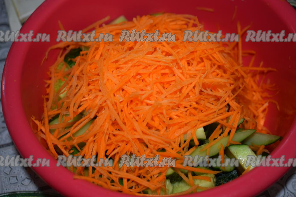 Морковь натираем на тёрке для корейской моркови и складываем в миску к огурцам.