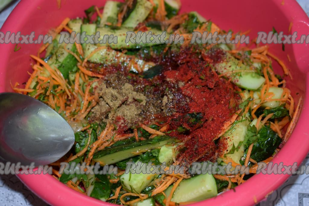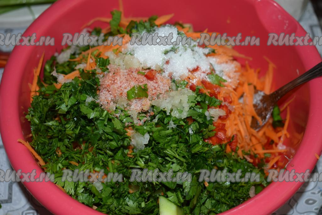 В миску к огурцам и моркови выкладываем измельчённую зелень и зелёный лук, острый перец и чеснок, солим и добавляем сахар.