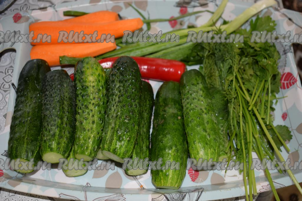 Подготовим продукты для салата. Огурцы промоем в холодной воде и отрежем кончики с двух сторон. Морковь очистим от кожицы. Зелень и зелёный лук промоем и обсушим.