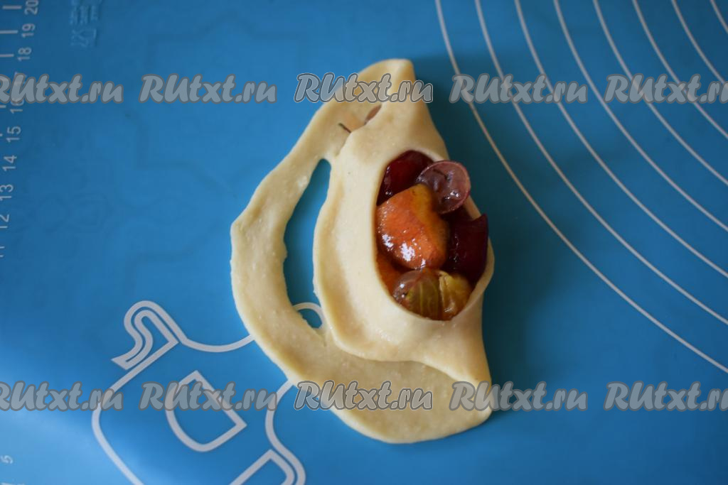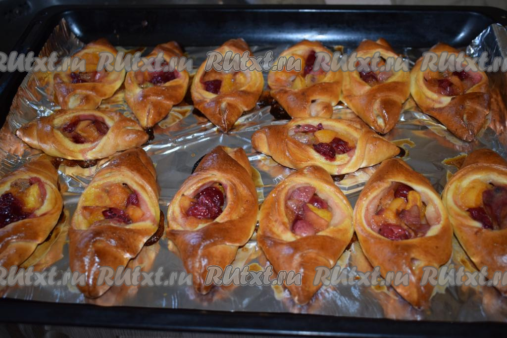 Во время выпечки открытые пирожки будут чудесно пахнуть фруктами и ягодами. Готовую выпечку достаём из духовки, снимаем с противня, смазываем при помощи кулинарной кисти слитым ранее соком от начинки, так пирожки получатся блестящими, ещё более мягкими и ароматными. Даём пирожкам остыть, накрыв их полотенцем.