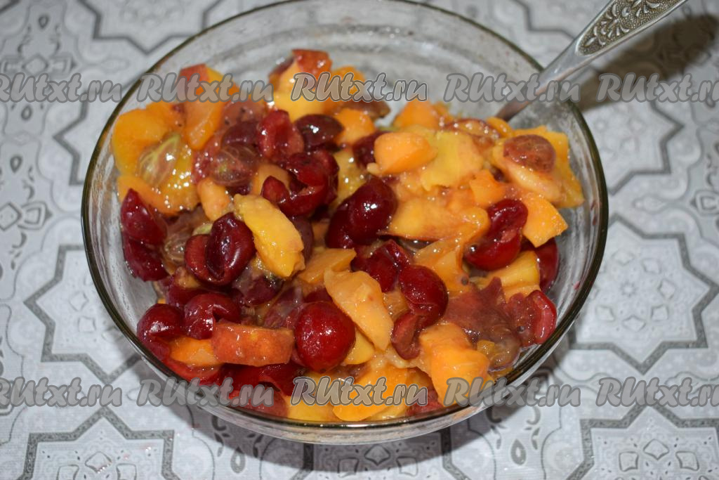 Пока подходит тесто, приготовим фруктово-ягодную начинку для пирожков. Вишню и абрикосы моем, удаляем косточки (можно добавить и другие фрукты, ягоды, я добавила крыжовник). Абрикосы нарезаем на небольшие кусочки. Соединяем вишню, крыжовник и нарезанные абрикосы, перемешиваем. Наша начинка почти готова (сахар пока не добавляем), отправляем её в холодильник до того момента, пока она нам не понадобится.
